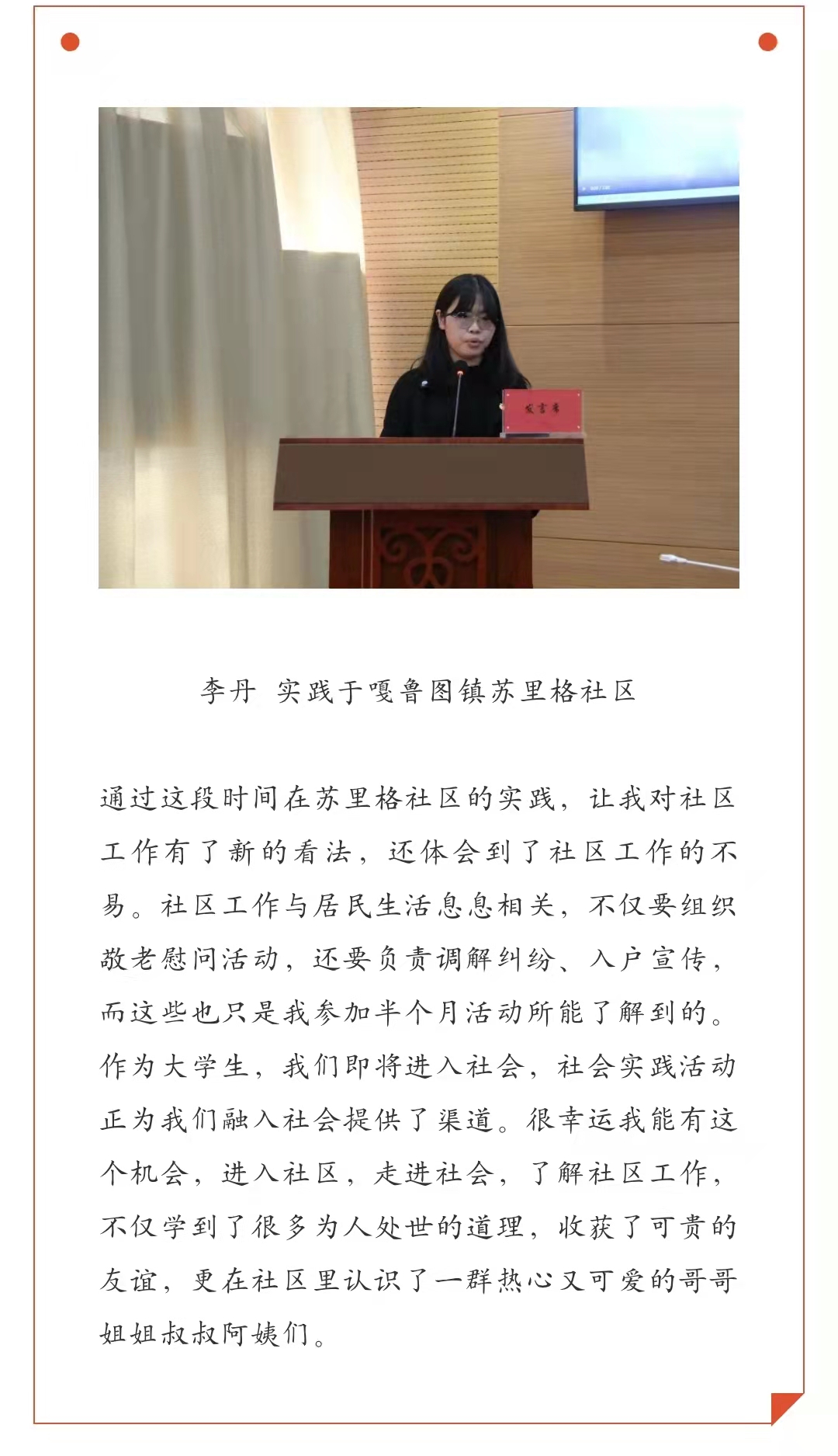 社区实习的这段时间,李丹同学感受到了社区工作是艰辛的,同时又是快乐的。艰辛是要面对社区的每位居民,为他们解决日常生活中的琐碎问题,还要面对部分居民对社区工作的不支持不理解,而快乐是能够为社区贡献自己的力量,也锻炼了自己的能力,收益颇丰。